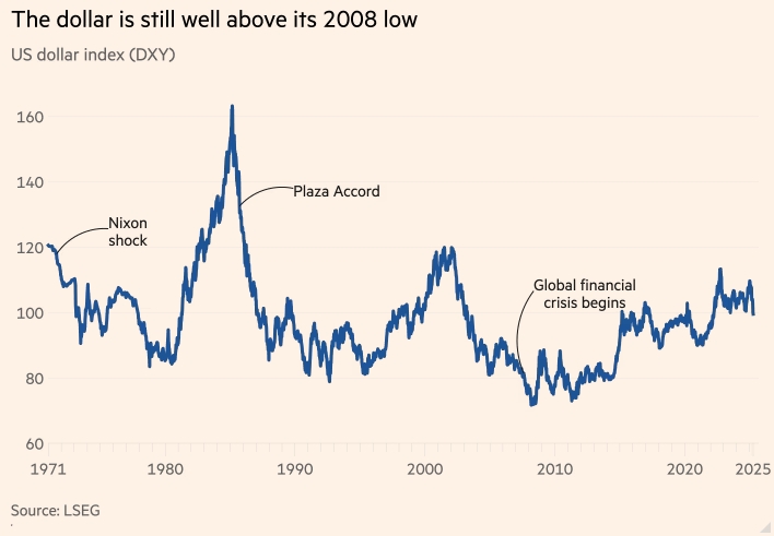 Случайно или намеренно, но почти каждое действие, предпринятое администрацией Трампа в первые три месяца её работы, ударило по доллару. На прошлой неделе индекс доллара DXY, который измеряет силу валюты по отношению к корзине крупнейших валют, упал на 2,8%. Это была седьмая худшая неделя за последние три десятилетия. На этой неделе он продолжил снижаться, увеличив падение в 2025 году до 8,2%.