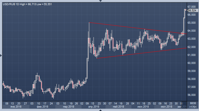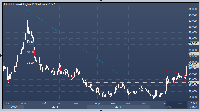 В пользу ослабления рубля говорит и техническая картина: USDRUB пробил верхнюю границу консолидационного диапазона с апреля, и теперь целью для пары является область около 69 рублей за доллар США, тогда как в целом можно говорить о потенциале для ралли по направлению к 73.