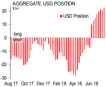 Объем чистого лонга по доллару достиг $23 млрд, что является рекордным значением с января 2017 года (в основном он куплен против иены, франка, фунта и аусси). Луни и киви также проданы, а мексиканский песо и евро куплены.