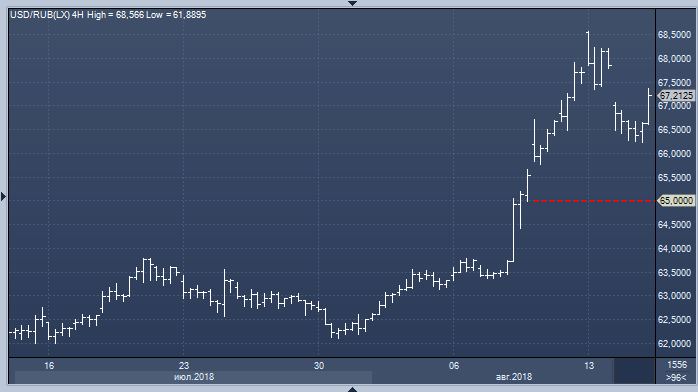 «Принимая во внимание негативную динамику рубля с начала августа, большое число налогоплательщиков, скорее всего, не конвертировали валюту заранее под предстоящую уплату налогов, в ожидании более слабого рубля», - пишут эксперты Райффайзен. - «Как следствие, в дни, близкие к уплате налогов (НДС, НДПИ 27 августа, налог на прибыль 28 августа в сумме 1.3 трлн руб.), может произойти заметное укрепление рубля в отсутствие негативных новостей на тему санкций против РФ. Однако в случае заметного укрепления (ниже 65 руб.) вероятно возобновление интервенций».