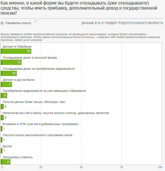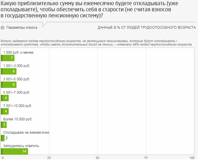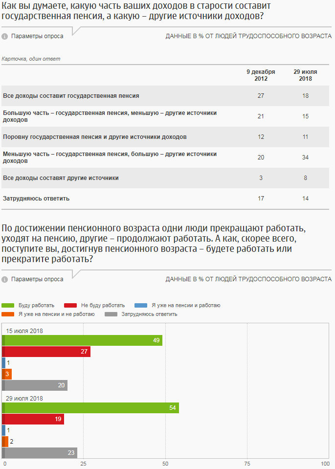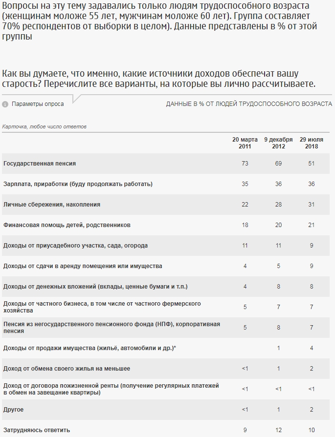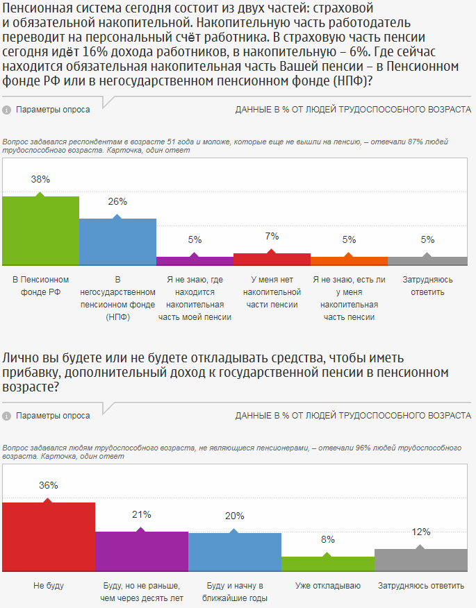 «Сегодня 18% людей трудоспособного возраста говорят, что все их доходы в старости составит государственная пенсия (в 2012 году такой ответ давали 27%), 15% (против 21% в 2012 г.) полагают, что пенсия будет основной частью средств к существованию. 34% (против 20% 6 лет назад) думают, что меньшую часть их доходов будут составлять пенсионные, а большую – иные поступления. 54% трудоспособных собираются на пенсии работать. Половина группы собираются откладывать деньги на старость (или уже это делают)», - говорится в пресс-релизе ФОМ.