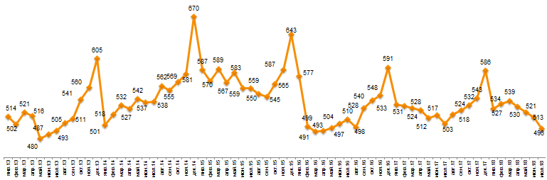 По данным холдинга «Ромир», в июле за один поход в магазин россияне тратили в среднем 496 рублей, что на 3.3% меньше июньских 513 рублей. Эксперты компании отмечают, что спад потребительской активности зафиксирован почти по всей стране — средний чек вырос лишь на Северном Кавказе (+15% м/м). В Москве сумма среднего чека составила 677 рублей (-1.2% м/м), а в Санкт-Петербурге — 636 рублей (-7% м/м). В гипермаркетах этот показатель опустился до 741 рубля (-9% м/м), в супермаркетах — до 347 рублей (-4.8% м/м), а в дискаунтерах — до 340 рублей (-3.4% м/м).