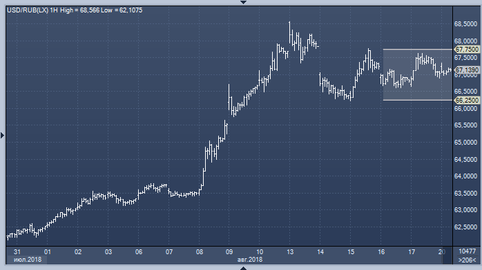 В начале торгов понедельника курс доллара к рублю предпринял попытку штурма локального сопротивления 67.35, однако на фоне стабильной ситуации на других развивающихся рынках вскоре скорректировался обратно к 67.