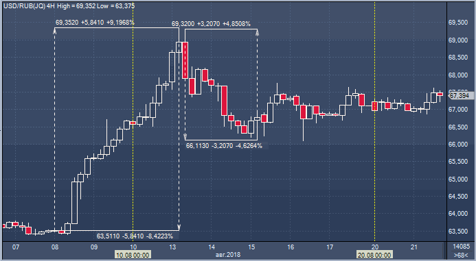 9 августа — за день до того как ЦБ приостановил программу покупок для Минфина — доллар вырос к рублю на 105 копеек и завершил торговую сессию на уровне 66,65. В понедельник 20 августа, когда ЦБ возобновил покупки иностранной валюты, курс USDRUB колебался в районе 67.00.