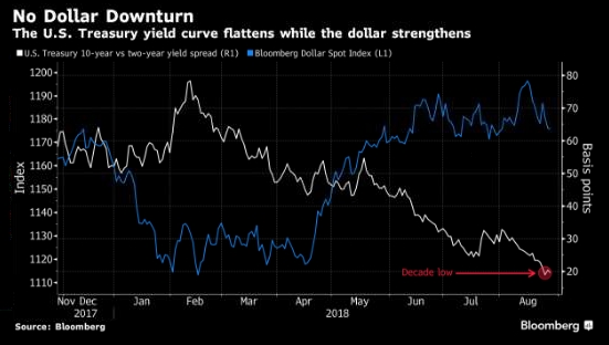 Кривая доходности казначейских облигаций с каждым днем становится все более плоской, но вряд ли это может подорвать укрепление доллара, если опираться на 70-летнюю статистику корреляции. Разница между доходностью двухлетних нот США и 10-летних эталонных облигаций Минфина США сократилась до десятилетнего минимума (см. график), порождая спекуляции о возможности инверсии. Обычно инверсия кривых также означает приближение экономического спада. Перевернутая кривая предшествует почти каждой рецессии, что заставляет некоторых инвесторов беспокоиться по поводу траектории доллара.