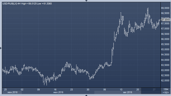 По итогам торгов во вторник 28 августа курс доллара к рублю вырос на 40 копеек до 67.86, а курс евро к рублю - на 46 копеек до 79.25 (прим. ProFinance.ru: по состоянию на 23:50 МСК).