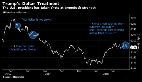 Доллар вырос более чем на 1.3 процента в этом году на фоне сильного роста экономики США и повышения процентных ставок Федеральной резервной системы. Доллар также покупали на фоне эскалации напряженности между США и их торговыми партнерами, но доллар начал падать, когда Трампа повторно обвинил Китай и Европейский Союз в манипуляции курсами валют для получение преимуществ во внешней торговле.