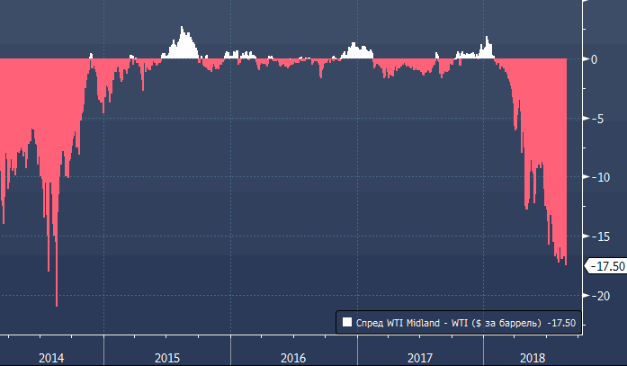 Разница между ценой WTI в Мидлэнд и бенчмарком достигла максимального уровня с августа 2014 года – спред сегодня приблизился к отметке в $18 за баррель.