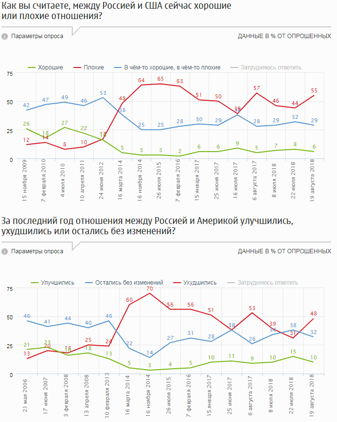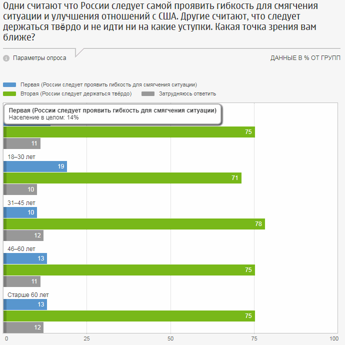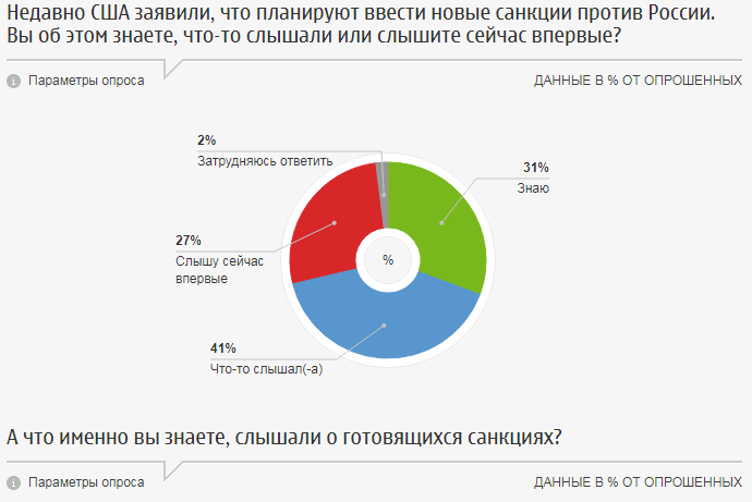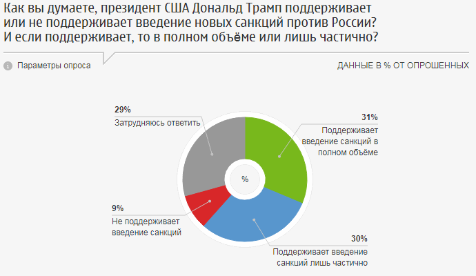 «33% россиян считают введение Америкой санкций признаком серьёзного обострения конфликта между нашими странами, 51% ничего принципиально нового здесь не видят. Три четверти опрошенных полагают, что России следует в этих обстоятельствах держаться твёрдо, не уступать, 14% наших сограждан (чаще – молодые) – за смягчение позиции. В оценках позиции Трампа по поводу санкций мнения разделились: 30% респондентов считают, что он поддерживает их полностью, 31% – что частично, 19% – что не поддерживает», - говорится в пресс-релизе (ФОМ).