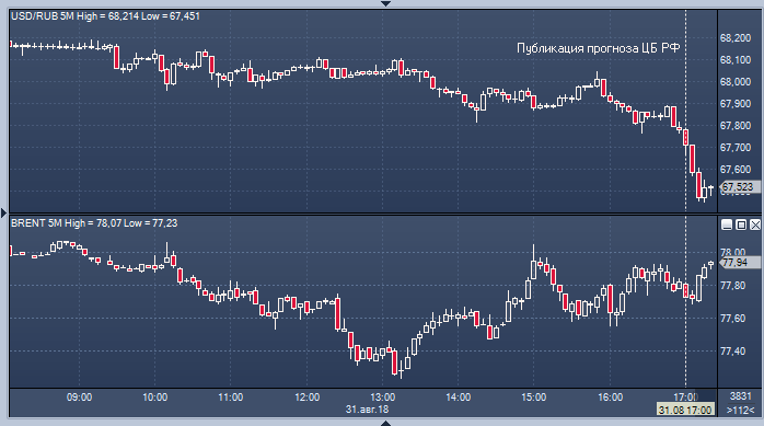 USD/RUB преодолел биды в районе 67.75 и в настоящее время штурмует поддержку в районе 67.50. Повод для активизации покупок рубля дал Банк России, который понизил прогноз по валовому внутреннему продукту (ВВП) на третий квартал с 1.5% — 2.0% до 1.3% — 1.7%, но сохранил прогноз на весь 2018 год на уровне 1.5% — 2.0%. Оптимизм центробанка относительно экономики был позитивно воспринят участниками рынка, которые в преддверии выходных предпочитают сокращать короткие позиции в рубле на фоне высоких цен на нефть, предпринимающих попытки роста, и хрупкой стабилизации ситуации на развивающихся рынках.
