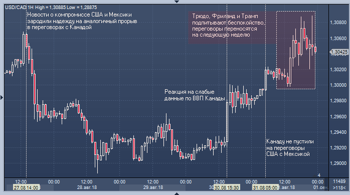 Комментарии канадских официальных лиц также были негативны для луни. Министр иностранных дел Канады Христя Фриланд заявила, что стране не нужна любая сделка и подпишет она лишь хорошее для нее соглашение. Премьер-министр Канады Джастин Трюдо же заявил, что не достичь никакого соглашения по НАФТА лучше, чем заключить плохое.