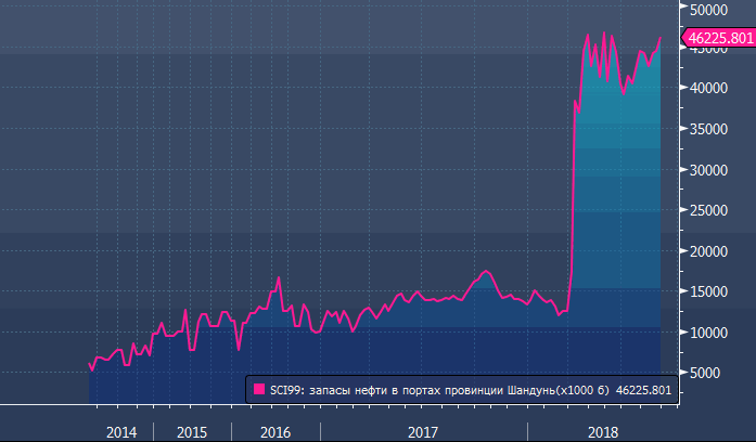 С учетом Циндао запасы «чёрного золота» в семи портах провинции Шандунь увеличились на 3.9% нд/нд до максимального уровня с 8 июня в 46.2 млн баррелей.