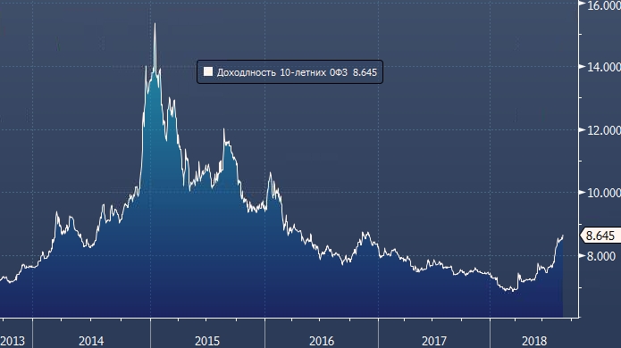 Банк России устами своего председателя Эльвиры Набиуллиной ужесточил риторику, что отразилось на котировках рубля и облигаций на торгах во вторник. Рубль укрепился, облигации снизились, а их доходность выросла. Доходность 10-летних облигаций федерального займа достигла отметки 8.84% годовых, впервые с конца ноября 2016 года, после того как глава Центробанка указала на появление факторов в пользу повышения процентных ставок. В частности, инфляция ускоряется быстрее ожиданий, в том числе под влиянием ослабления рубли, на динамику которого повлияло ухудшение ситуации на развивающихся рынках.