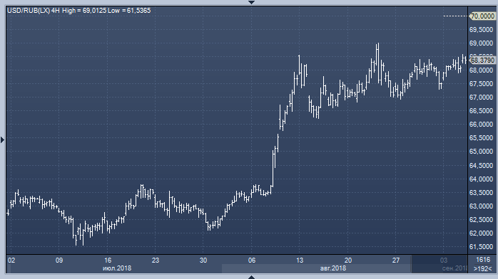 «Рубль остается под влиянием отложенных рисков новых антироссийских санкций», - пишет старший аналитик компании Юрий Кравченко. - «После введения последнего пакета в августе на рынке сохраняется «геополитическое затишье», однако из-за распродаж на площадках EM рубль не только не смог воспользоваться полученной передышкой, но и продолжил слабеть уже без санкционного давления. Если в августе доллар поднимался до 69 руб. лишь на пике влияния геополитических рисков, то сейчас торгуется в районе 68.5 руб. исключительно под влиянием кризисной обстановки на площадках EM. Если в подобных условиях возобновится и санкционная риторика, то американская валюта с легкостью окажется на уровне 70+ руб., а рубль заметно сократит отставание в отрицательной динамике от «коллег» на площадках EM.
