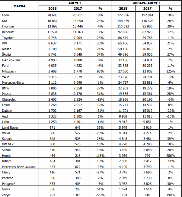 «С начала этого года восстановление рынка шло хорошими темпами с достижением 18% роста год к году к концу июля. В августе этот тренд продолжился, поддерживаемый пиком спонтанных покупок, связанных с недавним ослаблением рубля. В ближайшие месяцы рост, вероятно, продолжится, так как планируемое с января 2019 года повышение НДС в любом случае обеспечит высокий уровень спроса до конца текущего года», - отметил председатель комитета автопроизводителей АЕБ Йорг Шрайбер.