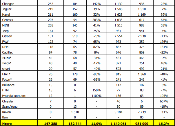 1. Продажи легких коммерческих автомобилей включены в цифру продаж для всего бренда, если они есть в линейке продаж (помечены *)