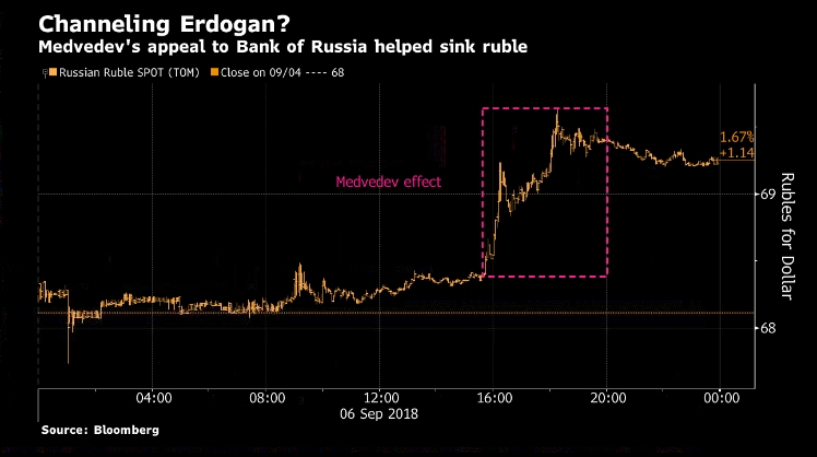 «Желает ли Медведев подражать президенту Турции, чьи требования придерживаться относительно низких процентных ставок привели к финансовому краху?» - задается вопросом Ульрих Лейтманн, глава отдела валютной стратегии Commerzbank во Франкфурте. «Кризис лиры напомнил всем, чем может закончиться катастрофическое политическое влияние на центральный банк».