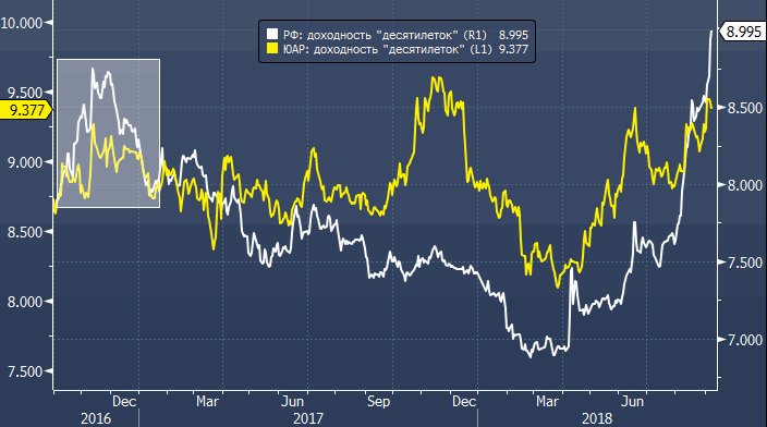 На прошлой неделе доходность российских «десятилеток» впервые с 2016 года превысила доходность аналогичных бумаг ЮАР. По мнению экспертов агентства Bloomberg, этот факт обусловлен тем, что перспективы повышения ставок в России и введения против страны новых санкций перевешивают вполне возможное снижение суверенного кредитного рейтинга ЮАР.