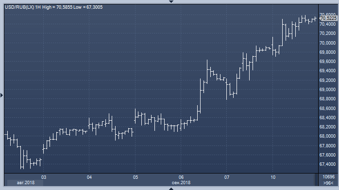 По итогам торгов в понедельник 10 сентября курс доллара к рублю вырос на 62 копейки до 70.53, а курс евро к рублю - на 93 копейки до 81.73 (прим. ProFinance.ru: по состоянию на 23:50 МСК).
