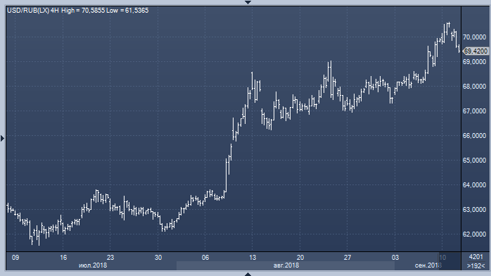 По итогам торгов во вторник 11 сентября курс доллара к рублю снизился на 1 рубль 11 копеек до 69.42, а курс евро к рублю - на 1 рубль 18 копеек до 80.55 (прим. ProFinance.ru: по состоянию на 23:50 МСК).