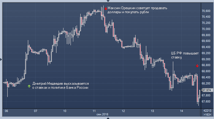 Те, кто последовал совету министра экономического развития России Максима Орешкина, могли неплохо заработать — за последние четыре дня курс доллара к рублю упал на 4%. Напомним, что министр рекомендовал продавать USDRUB 11 сентября, через несколько дней после того, как премьер-министр Дмитрий Медведев своими комментариями обеспечил паре импульс для рывка к максимальным уровням с марта 2016 года. Впрочем, вполне вероятно, что члены правительства были знакомы если не с конечным решением, то с позицией руководства центробанка относительно ставок.