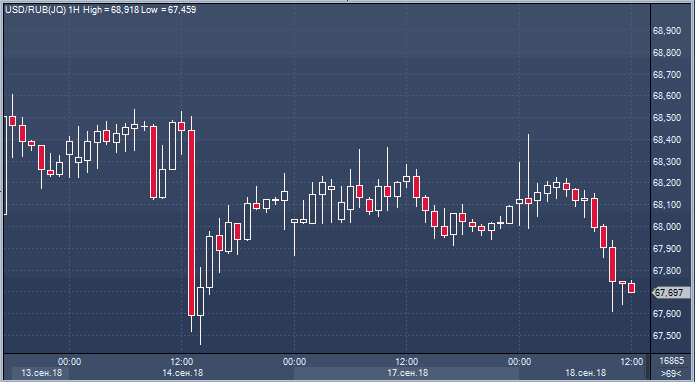 Курс рубля на торгах во вторник 18 сентября предпринимает попытки роста к доллару. Российская валюта восстановилась с 68.20 до 67.70. Однако тенденция может возобновиться, если участники рынка возьмут в фокус негативный эффект от новых пошлин США в отношении Китая, о которых Дональд Трамп сообщил в понедельник.