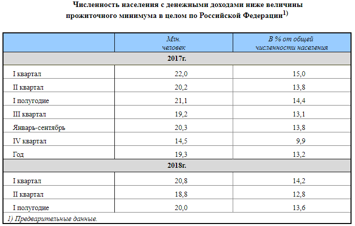 По данным ведомства, уровень бедности в стране в отчетный период составил 13.6% против 14.4% годом ранее и 14.6% в первой половине 2016 года. Росстат отмечает, что динамика уровня бедности имеет ярко выраженный сезонный характер — в первом квартале он, как правило, максимальный, а в четвертом — минимальный (в это время обычно выплачиваются годовые премии).