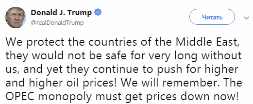 Президент США в своем твиттере обрушился с критикой на ОПЕК, требуя от Картеля незамедлительно снизить цены на нефть. При этом Дональд Трамп назвал ОПЕК монополией: