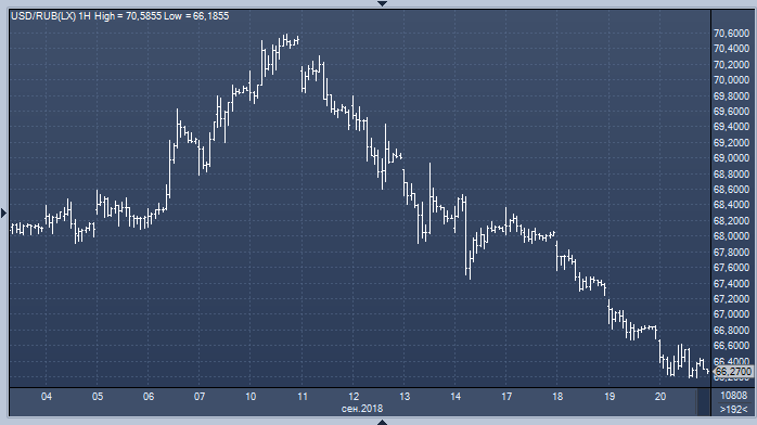 По итогам торгов в четверг 20 сентября курс доллара к рублю снизился на 53 копейки до 66.27, а курс евро к рублю вырос на 5 копеек до 77.98 (прим. ProFinance.ru: по состоянию на 23:50 МСК).