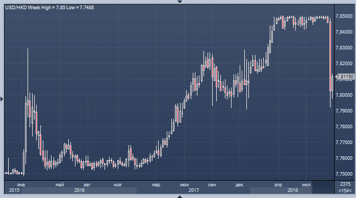 Закрытие прошлой недели ознаменовало собой резкие изменения в торгах гонконгским долларом — курс USDHKD в пятницу пробил поддержку около 7.84 и рухнул к минимальным уровням с декабря 2017 года в районе 7.7923. Ключевым драйвером движения стали потрясения на денежном рынке, где ставка овернайт HIBOR подскочила до максимальной отметки с 2006 года, когда ко дну пошел Lehman Brothers, а ставка недельного и месячного HIBOR достигла уровней 2008 года. Сужение спреда относительно LIBOR в долларах спровоцировало массовую ликвидацию лонгов в гонконгском долларе, что обернулось его максимальным за последние пятнадцать лет ростом против доллара США. Эффект такого развития событий был лишь усилен разочарованием от затянувшейся на несколько месяцев сессии попыток сломить линию обороны регулятора в районе 7.85.