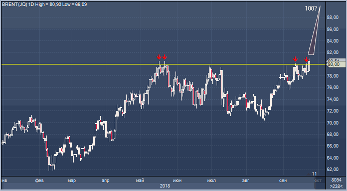 2017 год котировки Brent завершили в районе 66.60 за баррель. Текущая попытка закрыться выше $80 означает, что «черное золото» с начала года в течение 9 месяцев подорожало на 20%. Однако взлет цен с $80 до $100 за баррель подразумевает дополнительное 25-процентное укрепление за 3 месяца.