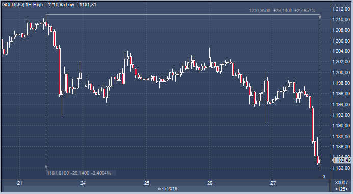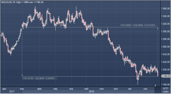 В прошлую пятницу 21 сентября цены на золото на спот-рынке сформировали максимум в районе $1211 за тройскую унцию. В настоящий момент котировки упали до $1182 за унцию. Снижение за неделю составляет 2.4%.