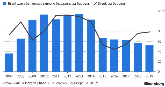 Однако на фоне позитивной динамики на рынке нефти Россия не собирается шиковать. Бюджет страны довольно жесткий и останется сбалансирован даже с учетом падения цены до $57 за баррель (-31% от текущих уровней). Это является минимальным показателем с 2007 года, утверждает Bloomberg, ссылаясь на данные JP Morgan и собственные оценки на 2019 год.