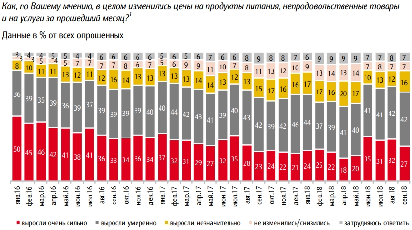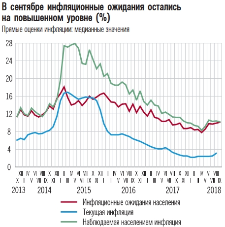 «Инфляционные ожидания населения сохранились в сентябре на повышенном уровне (10.1% после 9.9% в августе), на котором они находятся с мая в результате всплеска цен на бензин. Ослабление рубля также уже начало отражаться на инфляционных ожиданиях, отмечается в очередном выпуске информационно-аналитического комментария «Инфляционные ожидания и потребительские настроения населения».