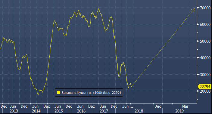 В настоящий момент объем запасов в Кушинге составляет порядка 20 млн баррелей. Citi прогнозирует, что к апрелю запасы увеличатся до 70 млн баррелей. В банке прогнозируют увеличение объемов добычи в Пермском бассейне. Все объемы добычи от Колорадо до Оклахомы и даже от Северной Дакоты до Канады, прежде чем добраться до НПЗ на побережье, идут через Кушинг.