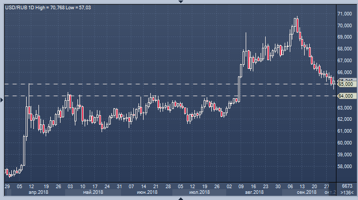 Курс рубля пока отражается динамику форекса (Forex) - немного снижается к евро и чуть больше к доллару, акции просели чуть сильнее. Индекс доллара растет, что является негативом для всего блока ЕМ-валют. Рубль вчера пробивал психологический уровень 65, достигая отметки 64.82, а сейчас котировки составляют 65.23. Евро сейчас торгуется на уровне 75.22.