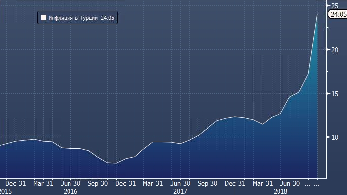 Инфляция выросла до 24.52 процента в прошлом месяце в годовом исчислении, согласно данным Турецкого института статистики. В августе инфляция составила 17.9 процента в годовом исчислении. Месячный скачок на 6.3 процента превысил прогноз 15 опрошенных Рейтер экономистов, ожидавших роста на 3.6 процента.