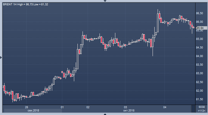 Цены на нефть Brent с начала года прибавляют порядка 30 процентов и находятся у максимумов с осени 2014 года из-за опасений инвесторов по поводу перебоя в поставках на фоне санкций США против Ирана. Сегодня цена нефти корректируется вниз, сейчас котировки Брента составляют 85.72 доллара за баррель, хотя ранее сегодня был достигнут пик 86.71 доллара за баррель. Падают американские акции на фоне ужесточения риторики ФРС и роста доходности облигаций в США. Это подавляет риск-настроения.