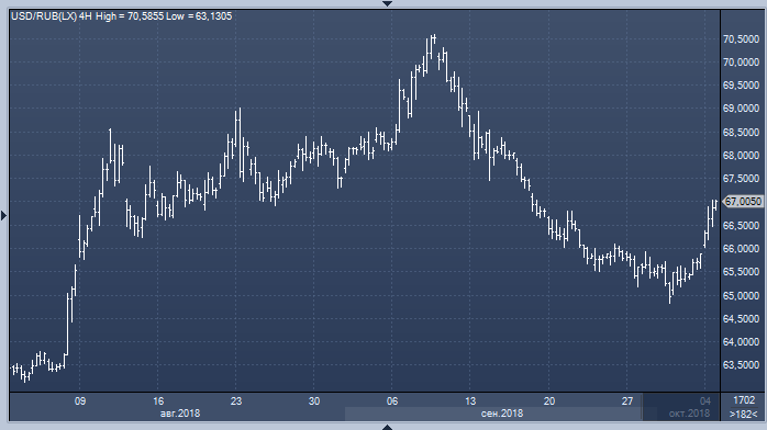 По итогам торгов в четверг 4 октября курс доллара к рублю вырос на 113 копеек до 67.00, а курс евро к рублю - на 152 копейки до 77.15 (прим. ProFinance.ru: по состоянию на 23:50 МСК).