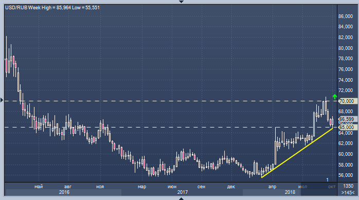 Мы, со своей стороны, лишь повторим давнюю точку зрения - тренд не может развиваться прямолинейно, он живет сменяющимися диапазонами. В данный момент мы осваиваем диапазон 65-70. Когда он будет пробит вверх - по тренду - и на каком поводе, пока сказать сложно. Предстоящее в ноябре ужесточение санкций уже закладывается в цену и вполне может быть оценено и текущим диапазоном - особенно при дорожающей нефти. А если нефть пойдет до 100, то правым может оказаться г-н Орешкин.