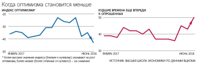Доля граждан, которые заявили социологам, что в будущем ожидают ухудшения экономической ситуации, в 2018 году выросла с 37% зимой до 50% летом. Такого пессимизма не наблюдалось с зимы 2016 года, а также с кризисного 1998 года. При этом доля тех, кто был уверен, что худшее позади, упала за это же время с 32 до 23%.
