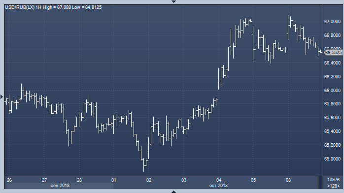 По итогам торгов в понедельник 8 октября курс доллара к рублю снизился на 5 копеек до 66.55, а курс евро к рублю - на 20 копеек до 76.51 (прим. ProFinance.ru: по состоянию на 23:50 МСК).