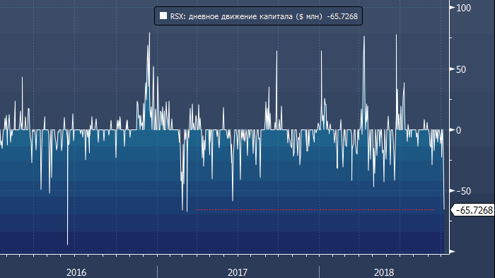 По данным агентства Bloomberg, в понедельник 8 октября отток капитала из биржевого фонда VanEck Vectors Russia, ориентированного на акции российских компаний (RSX), составил $65.7 млн (активы фонда составляют $1.5 млрд), что стало рекордным значением за последние 19 месяцев (с марта 2017 года). Таким образом, с начала года фонд лишился уже примерно трети активов, и, по мнению Павла Лаберко из Union Bancaire Privee, связано это с ожиданием введения Вашингтоном новых санкций против Москвы.