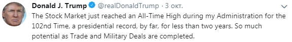 Ровно неделю назад (3 октября) президент США сообщил в своем твиттере, что «За время моего президентства (менее двух лет) фондовый рынок в 102-й раз обновил исторический максимум, что является рекордом для любого президентского срока. Большой потенциал по мере завершения торговых и оружейных сделок».