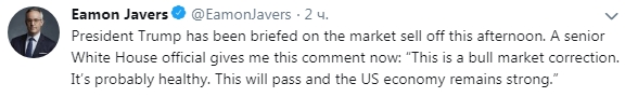 Вчера американские фондовые индексы рухнули примерно на 4%, и, по словам вашингтонского корреспондента CNBC Имона Джеверса, сегодня на брифинге в Белом Доме Дональд Трамп, отвечая на вопросы журналистов, сказал, что «Это — коррекция в рамках бычьего рынка. Вероятно, она носит здоровый характер. Это пройдет, а американская экономика остается сильной».