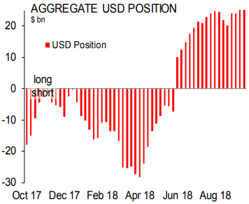Из последнего отчета CFTC следует, что за неделю до 9 октября объем чистой длинной спекулятивной позиции по доллару вырос на $1.3 млрд до нового многолетнего максимума в $28 млрд. При этом заметные изменения в позиционировании затронули лишь евро и луни.