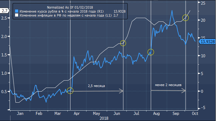 Девальвация рубля с временной задержкой находит свое отражение в росте потребительской инфляции. Так, резкое ослабление рубля наблюдалось в начале апреля 2018 года. Однако ответный резкий инфляционный всплеск случился в конце июня — по прошествии почти двух с половиной месяцев.