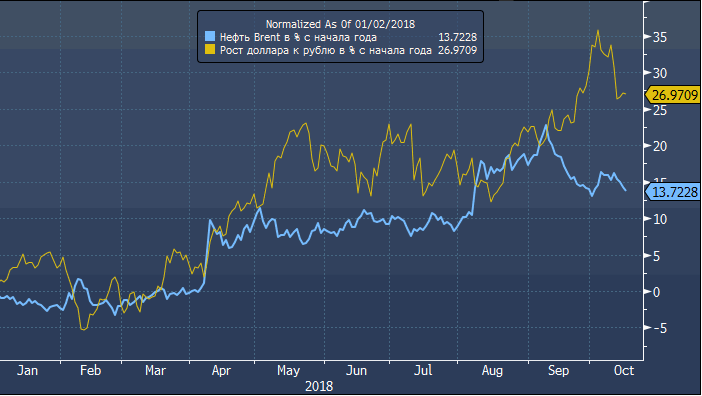 Нефть является основой экспорта РФ. С середины августа цена выросла почти на 14% из-за ожидания введения санкций против Ирана. Курс рубля с апреля снизился на 15% после введения Вашингтоном санкций против РФ за предполагаемое вмешательство в американские выборы 2016 года.