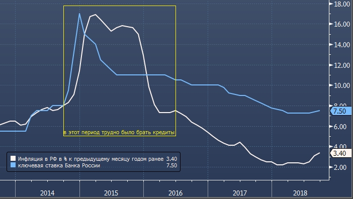 Ставки по ипотеке, которые устанавливают кредитные организации, зависят от ключевой ставки ЦБ РФ. В конце 2014 года произошел резкий взлет инфляции. Банк России значительно повысил ключевую ставку. Ипотека на протяжении 2015 и некоторой части 2016 г. была малодоступна. Этот рынок оживился только в 2017 г. К началу 2018 г. инфляция была на рекордно низком уровне, а ключевая ставка вернулась к значениям середины 2014 г. Поскольку цены на жилье были стабильны в 2017-м, текущий год показал высокий спрос на ипотеку у заждавшегося населения.