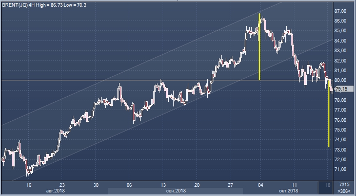 После того как цены на нефть Brent опустились ниже $80 за баррель, техническая картина стала негативной. Этот психологический уровень является ключевым. С начала года цена Brent 4 раза атаковала $80 за баррель в безуспешных попытках закрепиться выше. Пробить сопротивление удалось лишь с пятой попытки — 24 сентября. С тех пор отметка превратилась в важную поддержку, но в четверг она не устояла. Была пробита. Теперь цены на нефть имеют потенциал дальнейшего снижения ниже $74 за баррель.